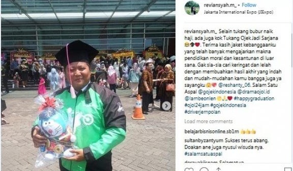 “Selain tukang bubur naik haji, ada juga kok tukang ojek jadi sarjana. Terima kasih jaket kebangganku yang telah banyak mengajarkan makna pendidikan moral dan kesantunan di luar sana. Nggak sia-sia cari keringat dan lelah dengan membuahkan hasil akhir yang indah dan mudah-mudahan kamu bangga juga ya sayangku @reshanty_06. Salam satu aspal @gojekindonesia,” tulisnya dalam kolom keterangan foto.