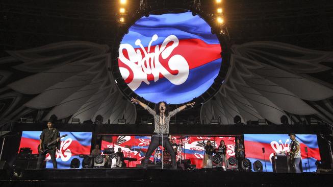 Aksi panggung grup musik Slank saat tampil pada konser 35 Tahun Slank di Stadion Utama GBK, Jakarta, Minggu (23/12). di industri musik Indonesia. [ANTARA FOTO/Dhemas Reviyanto]