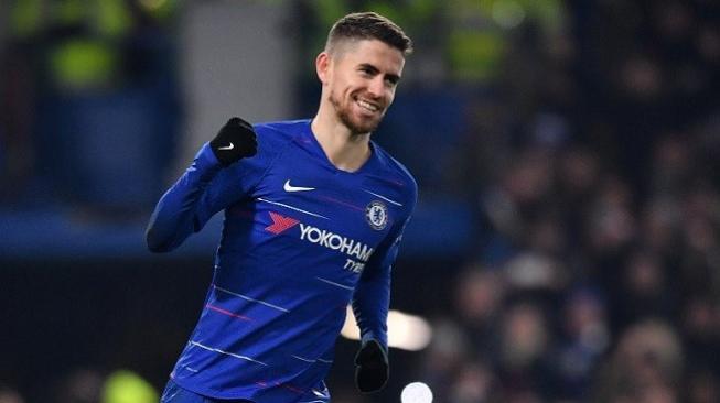 Selebrasi pemain tengah Chelsea Jorginho usai mencetak gol di babak penalti melawan Tottenham Hotspur. Dalam laga ini Chelsea menang 4-2. (Ben STANSALL / AFP)