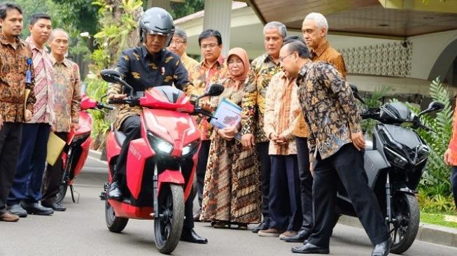 Jokowi menjajal motor listrik Gesits. (Suara.com/Dwi Bowo Raharjo)