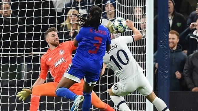 Aksi Harry Kane saat mencetak gol kedua untuk kemenangan Tottenham Hotspur atas Olympiakos dengan skor 4-2 di Liga Champions. (GLYN KIRK / IKIMAGES / AFP_