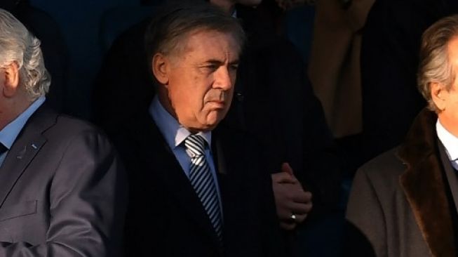 Manajer baru Everton Carlo Ancelotti menyaksikan laga Everton vs Arsenal di Goodison Park. Paul ELLIS / AFP