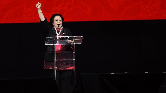 Ketua Umum PDI Perjuangan Megawati Soekarnoputri menyampaikan pidato politiknya dalam peresmian pembukaan Rapat Kerja Nasional (Rakernas) I di Jakarta, Jumat (10/1). [ANTARA FOTO/Aditya Pradana Putra]