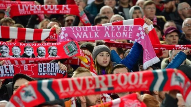 Suporter Liverpool memberikan dukungan saat tim kesayangan mereka menjamu Watford di Anfield pada 27 Februari 2019 [AFP]