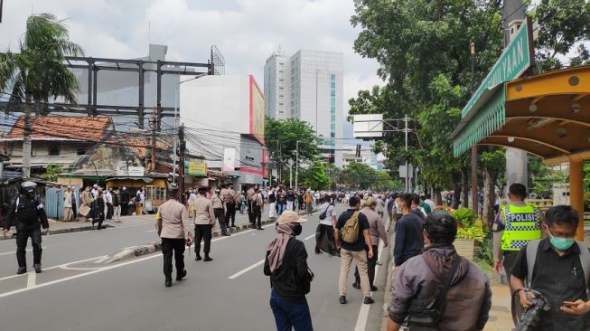Aparat dan massa masih bersinggungan di Jalan Abdul Muis mengarah ke Harmoni, Jakarta Pusat.