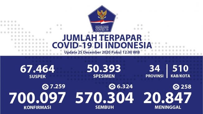 Data kasus Corona di Indonesia hingga Jumat, 25 Desember 2020. (Satgas Covid-19)
