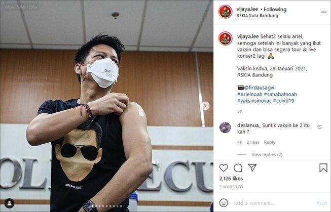 Salah satu akun Instagram yang membagikan potret Ariel ketika divaksin adalah akun fanbase @vijaya.lee. Dalam unggahan itu, Ariel tampil santai memakai kaus hasil kolaborasinya dengan Greenlight saat divaksin.