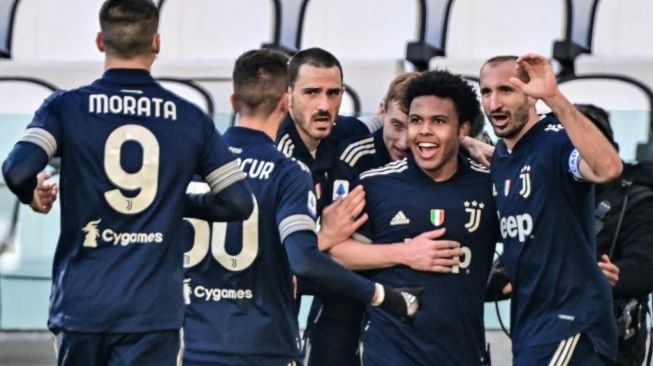 Para pemain Juventus merayakan gol ke gawang Bologna pada laga Liga Italia di Juventus Stadium, Turin, Minggu (24/1/2021) malam WIB. [MIGUEL MEDINA / AFP]