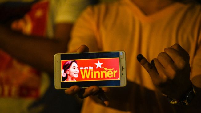 Seorang pendukung partai Liga Nasional untuk Demokrasi (NLD) memegang ponsel yang menunjukkan gambar Aung San Suu Kyi di depan markas partai di Yangon pada 8 November 2020, [Ye Aung THU / AFP]