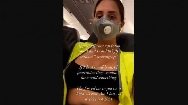 Isabelle Eleanore diberi rompi safety oleh pramugari karena bajunya dianggap terlalu terbuka.[Instagram]