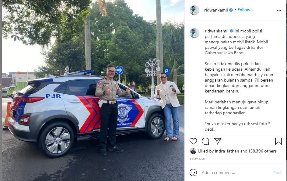 “Ini mobil polisi pertama di Indonesia yang menggunakan mobil listrik. Mobil patwal yang bertugas di kantor Gubernur Jawa Barat.” tulis @ridwankamil.