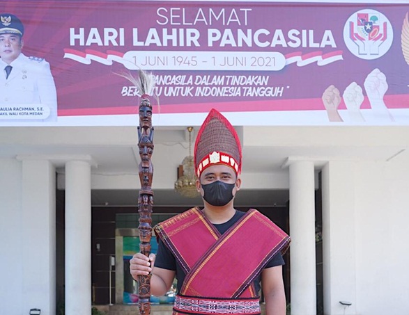 MEDANHEADLINES.COM, Medan- Wali Kota Medan Muhammad Bobby Afif Nasution tampil berbeda dengan memakai pakaian adat Toba di Hari Lahir Pancasila 1 Juni 2021.