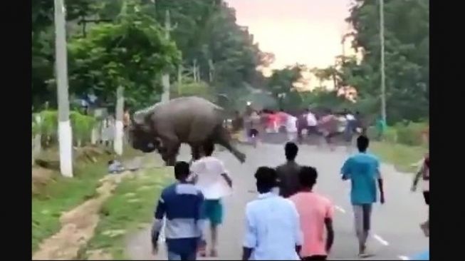 Tiba-tiba seekor gajah berbelok dan berlari ke arah warga yang coba mengganggunya. Pada saat itu, ada seorang pria yang terjatuh saat hendak melarikan diri.