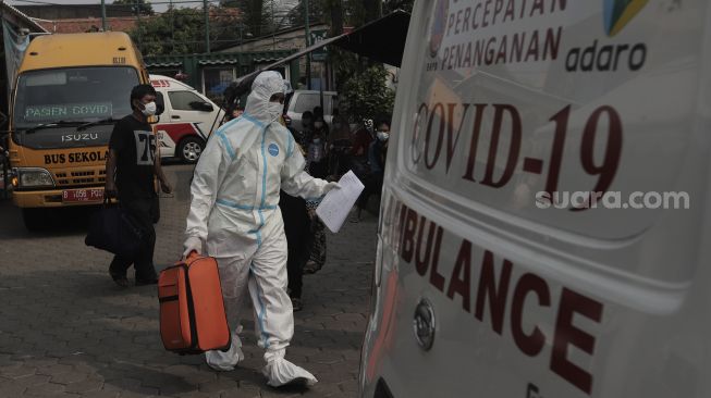 Petugas membantu membawa barang bawaan pasien terkonfirmasi COVID-19 ke dalam mobil ambulans di Puskesmas Kecamatan Pasar Minggu, Jakarta, Jumat (11/6/2021). [Suara.com/Angga Budhiyanto]