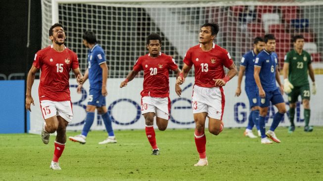 Pesepak bola Timnas Indonesia Ricky Kambuaya (kiri) melakukan selebrasi usai membobol gawang Timnas Thailand dalam pertandingan Babak Final Leg 2 Piala AFF 2020 di National Stadium, Singapura, Sabtu (1/1/2022). [ANTARA FOTO/Flona Hakim]