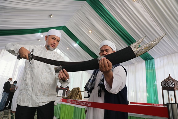 Suasana haru menyelimuti Masjid Al Musannif. Ijeck pun tidak kuasa menahan tangis, saat akan membuka Pameran Artefak Rasulullah. “Secara resmi pameran ini saya buka. Saya harap semua yang datang bisa tertib, tidak perlu berebut karena panitia akan mengatur semua bisa melihat,” ujar Ijeck yang juga Ketua Yayasan Haji Anif.
