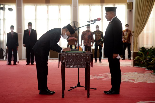 “Tugas anda sudah ditunggu rakyat Sumut. Pastikan anda jujur, benar, berani, tulus dan ikhlas, ” kata Edy Rahmayadi pada pelantikan Sekdaprov Sumut Arif Sudarto Tri Nugroho di Aula Tengku Rizal Nurdin, Rumah Dinas Gubernur, Jalan Sudirman 41, Medan, Jumat (19/8). Turut hadir Wakil Gubernur Sumut Muda Rajekshah, Ketua DPRD Sumut Baskami Ginting, perwakilan Forkopimda Sumut, dan Organisasi Perangkat Daerah (OPD) Pemprov Sumut.