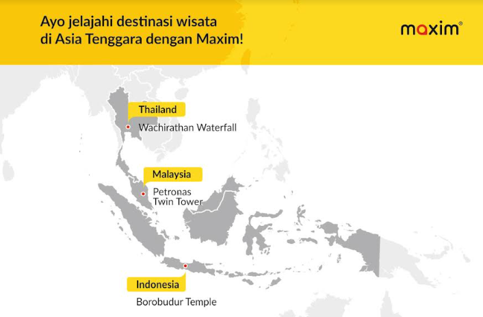 Tahukah anda, Maxim sebagai layanan penyedia transportasi daring internasional telah tersedia di beberapa negara di seluruh dunia. Di Asia Tenggara, layanan Maxim telah tersedia di banyak kota yang pastinya akan memudahkan anda untuk bepergian ke destinasi wisata manapun tanpa perlu mengunduh banyak aplikasi.