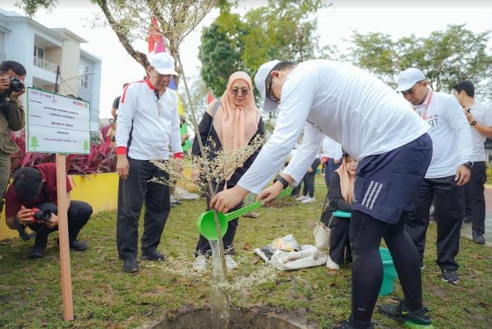 MEDANHEADLINES.COM, Medan – Tidak hanya bersepeda santai, penanaman pohon juga menjadi salah satu agenda jelang pembukaan Pertemuan ke-5 Indonesia Malaysia Thailand Growth Triangle (IMT GT) Green Cities Mayor Council (GCMC) di Taman Gajah Mada Jalan Gajah Mada Medan, Senin (31/10). Ada 5 jenis pohon yang ditanam Wali Kota Medan Bobby Nasution beserta seluruh peserta IMT GT sebagai simbolis mendukung terwujudnya kota hijau (Green Cities).