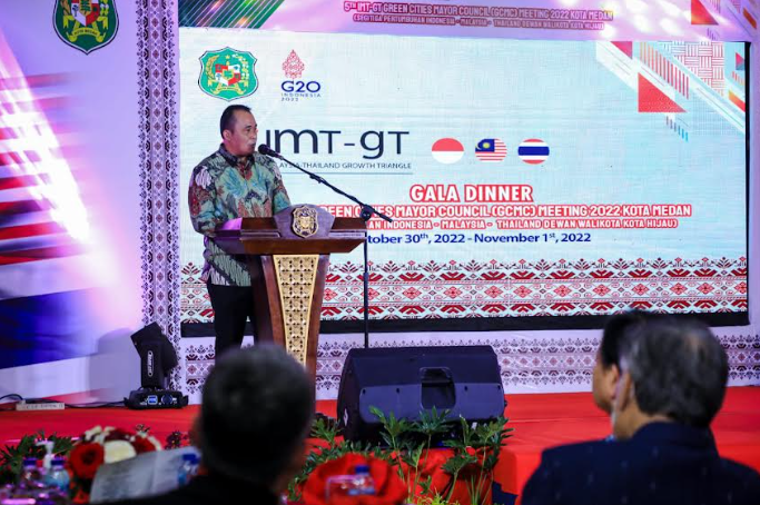 MEDANHEADLINES.COM – Suasana kekeluargaan nan hangat begitu terasa saat Gala Dinner The Fifth Indonesia Malaysia Thailand Growth Triangle (IMT GT) Green Cities Mayor Council (GCMC) Meeting Tahun 2022 di Medan Club, Selasa (1/11). Para Wali Kota dan Delegasi yang hadir tak sungkan berbaur dan saling berbagi cerita diantara mereka sambil menikmati sajian makanan yang disediakan.