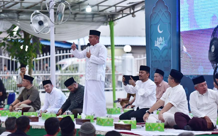 Gubernur mengajak hadirin bersama-sama memanfaatkan momen Ramadan untuk meningkatkan ketakwaan kepada Allah. “Posisi kita sama, tak ada bedanya. Karena kita sama-sama dituntut untuk bertakwa kepada Allah. Kalau pun saya berdiri di atas sini, supaya kalian semua bisa lihat saja,” ujar Gubernur di hadapan seribuan massa yang hadir.
