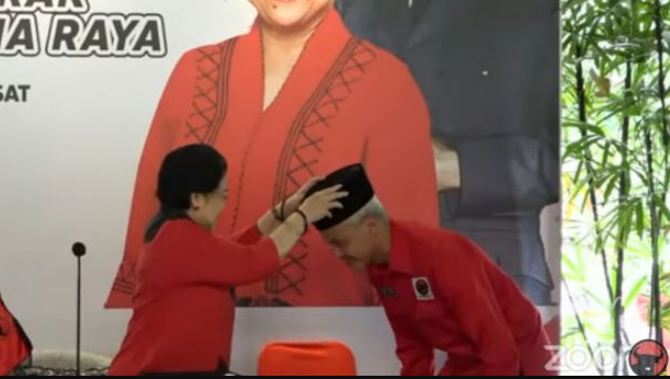 Megawati pun langsung memakaikan kopiah di kepala Ganjar Pranowo. Usai dipakaikan kopiah, Ganjar lalu mencium tangan Presiden kelima RI itu.