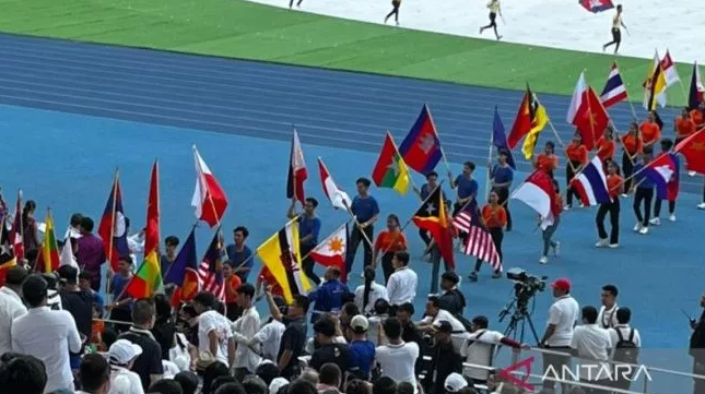 MEDANHEADLINES.COM – Bendera Indonesia terbalik saat upacara pembukaan SEA Games 2023 di Morodok National Stadium, Phnom Penh, Kamboja, Jumat (5/5/2023).