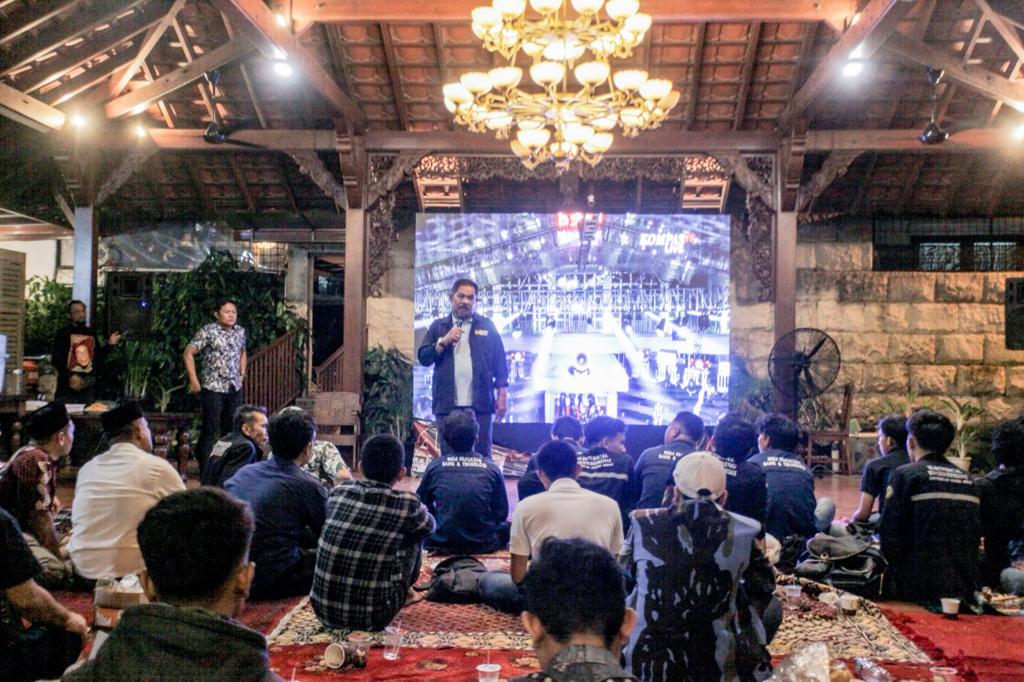 Caleg DPR-RI Partai NasDem Dapil Sumut 1, Drs. H. Rahudman Harahap MM saat  menyampaikan kata sambutan di depan generasi milenial sebelum acara Nobar Debat Perdana Capres-Cawapres Pemilu 2024. (Foto: Istimewa)